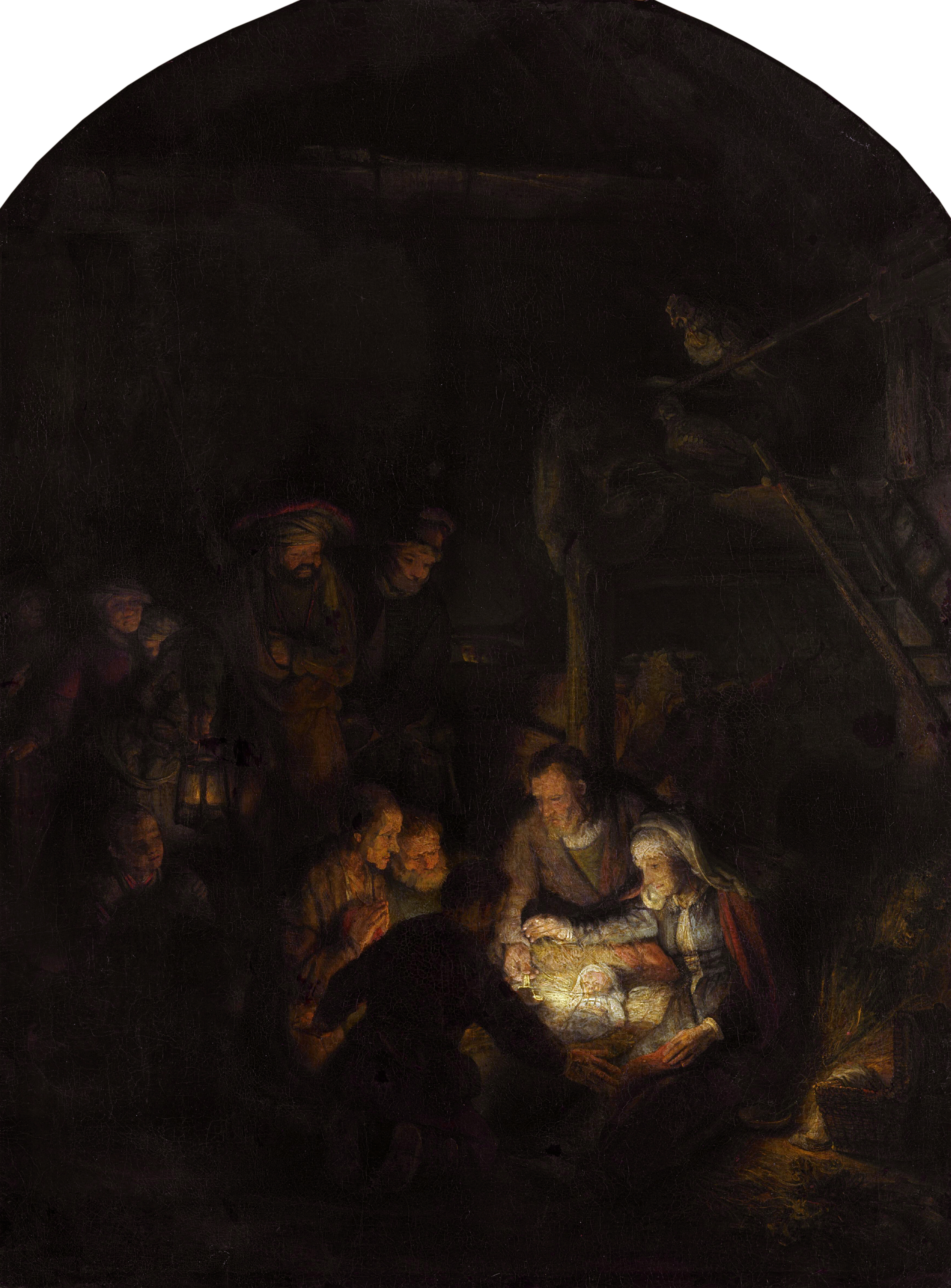 Nativity Scene of Peace (Adoration of the Shepherds / Die Anbetung der Hirten), 1646, Rembrandt van Rijn (Dutch Baroque Era Painter and Engraver, 1606-1669), Oil on canvas, 97 x 71,5 cm, (38.2 × 28.1 in), Alte Pinakothek, Munich, Germany. Large size here.